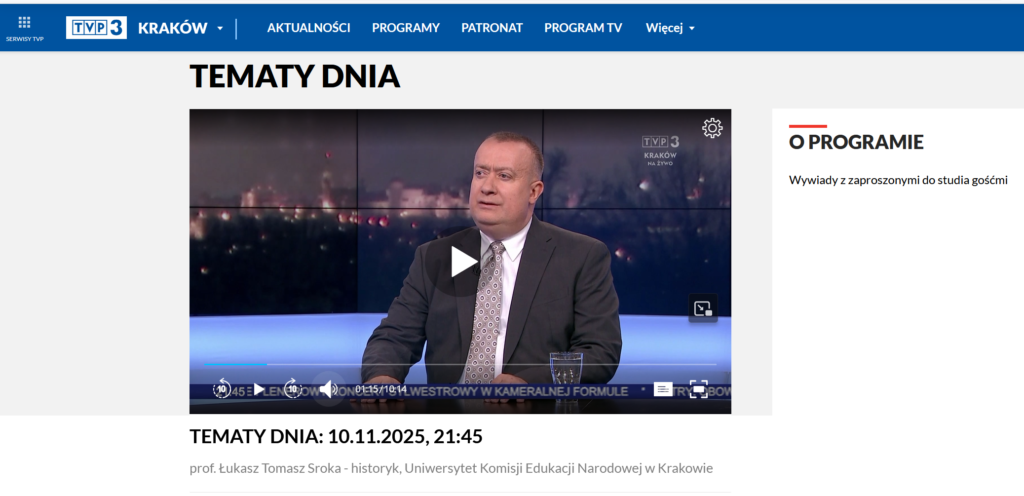 Prof. dr hab. Łukasz Tomasz Sroka w TVP3 W związku z Narodowym Świętem Niepodległości w "Tematach Dnia" prof. dr hab. Łukasz Tomasz Sroka...